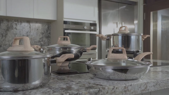 - Rivetless Wooden Finish Handles: Indulge in a seamless cooking and cleaning experience, complemented by the aesthetic charm of our innovative rivetless handle design. Our bakelite handles boast an attractive wooden finish, ensuring a comfortable and insulated grip that elevates both style and functionality.